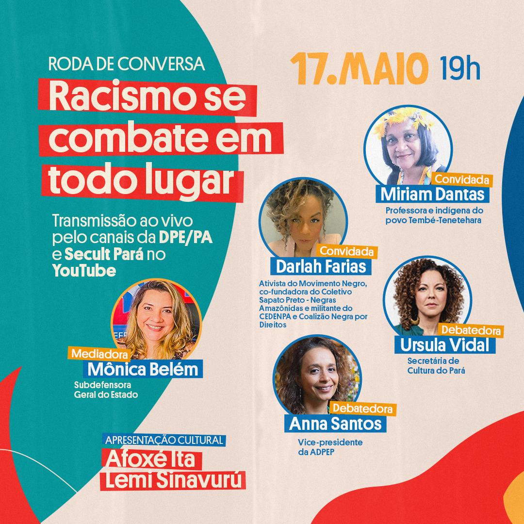 17/05; 19h – Roda de Conversa: Racismo se Combate em Todo Lugar, na Estação Gasômetro (Parque da Residência). Convidadas: Dharla Farias (advogada, ativista do Movimento Negro, coofundadora do Coletivo Sapato Preto – negras Amazônida e membra/militante do CEDENPA e da Coalizao Negra por Direitos) e Mirian Dantas (indígena do Povo Tenetechar-Tembé, mestre em Psicologia Clínica e Social pela UFPA). Debatedoras: Ursula Vidal (secretária de Cultura do Estado), Anna Izabel e Silva Santos (Vice-Presidente da ADPEP). Mediadora: Sub-Defensora Geral Mônica Belém. Teremos a apresentação de Edson Catendê. O evento será transmitido pelo canal do YouTube da SECULT e DPPA.